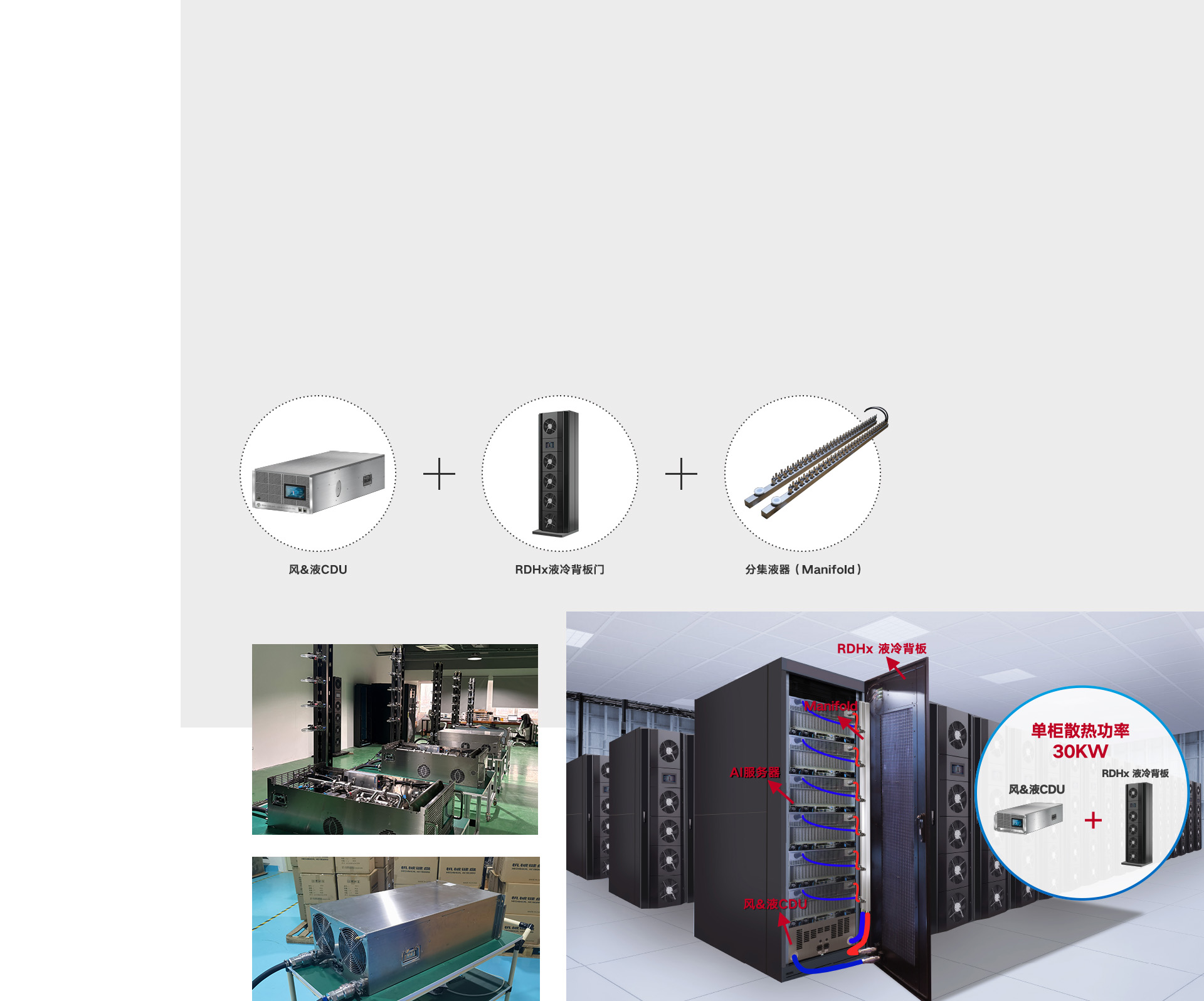Applied to traditional air-cooled computer rooms, AI/GPU servers can also be used without any modifications to the room. This solution does not rely on complex outdoor cold source pipelines and forms an independent cooling system through core components such as built-in circulation pumps, fans, and heat exchangers. The heat dissipation power of the wind and liquid CDU is 13KW, and the heat dissipation power of the whole cabinet with the back panel door is 30KW. It completely solves the heat dissipation problem caused by traditional liquid cooled servers in computer rooms with computing power requirements.